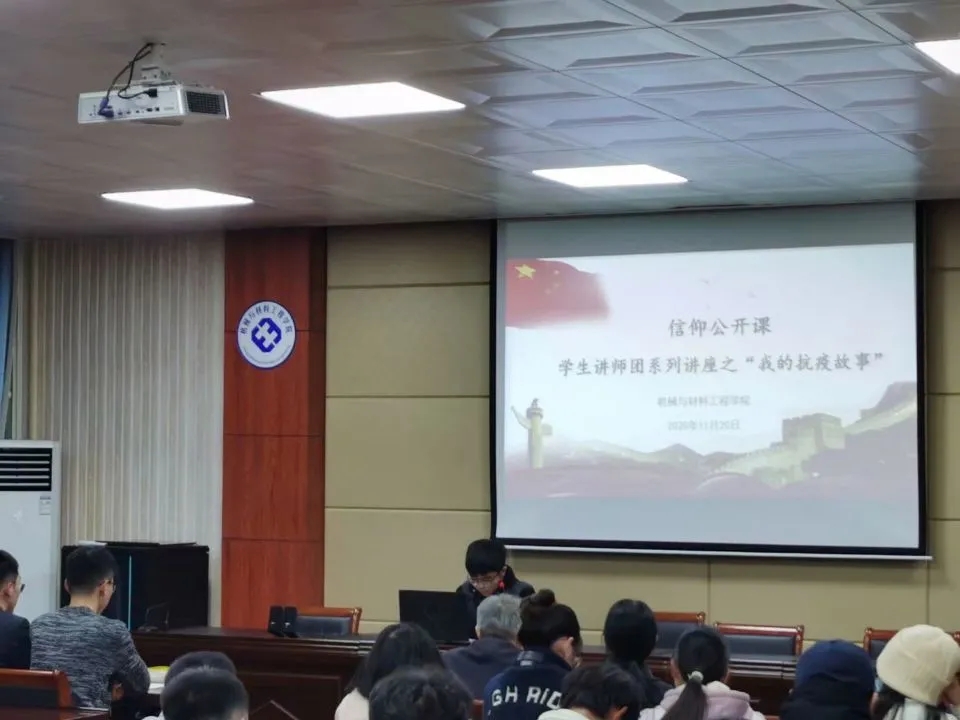 机械与材料工程学院于2020年11月20日20:00在15401开展信仰公开课:学生讲师团系列讲座之“我的抗疫故事”活动。本次讲座由学院学生讲师团成员徐磊和叶伟龙两位江苏省大学生抗疫先进个人分享他们的抗疫故事。院关工委副主任徐亚洲老师和团委副书记郭巧会老师,以及2020级100名学生代表参加本次活动。